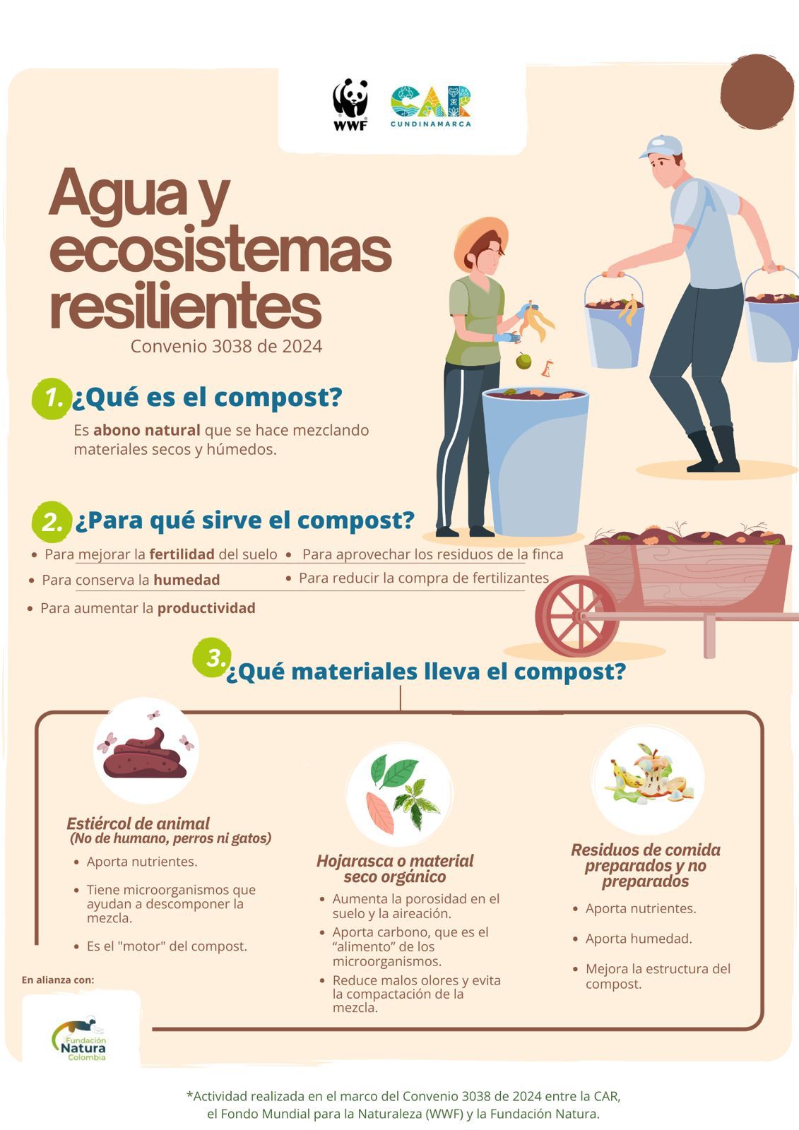 En los municipios cundinamarqueses de Zipacón, Cachipay, Caparrapí y Yacopí, el proyecto Agua y Ecosistemas Resilientes promueve la implementación de sistemas de compostaje como una herramienta práctica para mejorar los suelos y reducir costos en las fincas.